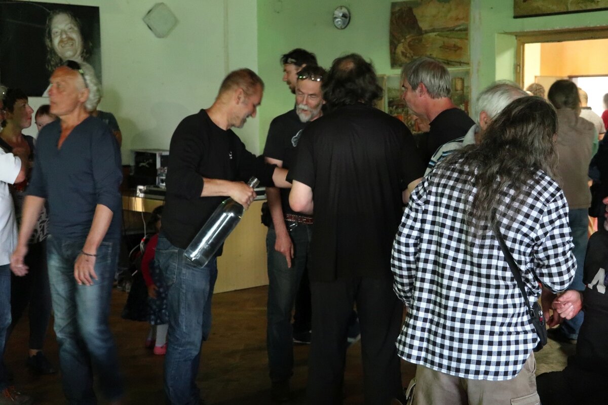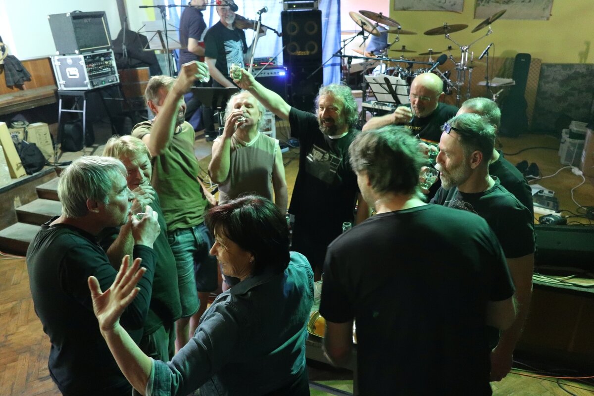 Měl jsem obavy jak to všechno proběhne. Mnoho oslavenců a organizátorů a mnoho neznámých. Dle našeho starého hesla: „vždycky je všechno jinak“ a hesla pro tuto akci: „hlavně přežít“ se vše odvíjelo. Pro vystoupení bylo v plánu nacvičit hit TRP Lepší ruka zdravá s Bobšem z Havířova. To se nepovedlo, protože hrál na jiné akci. Ale měli jsme hosta Dušena Svíbu, který se mnou hrál v kapele Crocus – bigbítu ze 70. let. Den předtím jsme vyzkoušeli společně zazpívat Starless, což bylo výborné, ale Vašek chtěl ještě Bacha Jesus bleibet meine Freude s klasickou naši pastí v prolínání 3/4 hlavního partu a 4/4 rytmu bicích. To nebyl dobrý nápad. Ráno jsme se ještě hudebně občerstvili a po poledni navezli aparát. Nikde nikdo jen několik přiopilých kamarádů, samozřejmě včetně Kaštana a jeho baní. Ale pak již to mělo progresivní vývoj. Zvukařem nakonec byl Roman Štěrba, který si vše perfektně připravil. Hráli jsme průřez repertoárem, vše by se nestihlo v limitu 90 minut. Zvuk byl výborný, bylo to snad poprvé kdy jsme si to plně s Vaškem užili, protože jsme slyšeli vše co bylo potřeba pro správné vyznění. Roman mile překvapil. Vstupem do oslav z naší strany byla dámská volenka. Ta byla vyhlášena, ale oslavenci nikde (asi měli strach), my odehráli Imagine a náhle se objevil velký stůl se slivovicí a následoval přípitek oslavenců. No a dámská volenka naostro opět s Imagine. Nálada super. Ve finále jsme se s vervou pustili do Starless, tento hudební monument se povedl se vším všudy. Pozdrav pro Johna Wettona k jeho nedožitým 70. narozeninám. Navštívilo oslavu řada přátel včetně mé rodiny (sestra švagr synovci …). Dva synovci jsou muzikanti a docela oslnili svou sbírkou kytar. Následovala Posádková hudba se svým řízným androšem, který mně spíše připomíná rané Etc. Amádovi jsem pomohl s projekcí jejich doprovodných animací a nálada byla jak má být. Další byla parta Jam Club Special. A to bylo opravdové uvolnění při Zappovi, Doors … prostě elixír. V té době jsme pouštěl přes dataprojektor výběr fotek z akcí v různých dobách. To byla další věc, poznávat se v čase se ukázalo jako výborný nápad. Lidi se bavili. No a najednou byla noc. Ještě pár pozdravů, krátký pokec s Martinem Knorem a Filim. No a byl konec, Vše bylo zdarma a k dispozici pro všechny, až závěrem jsem zjistil, že jsem nestihl ani okusit všechny pokrmy a nápoje. Příště už nebude. No…